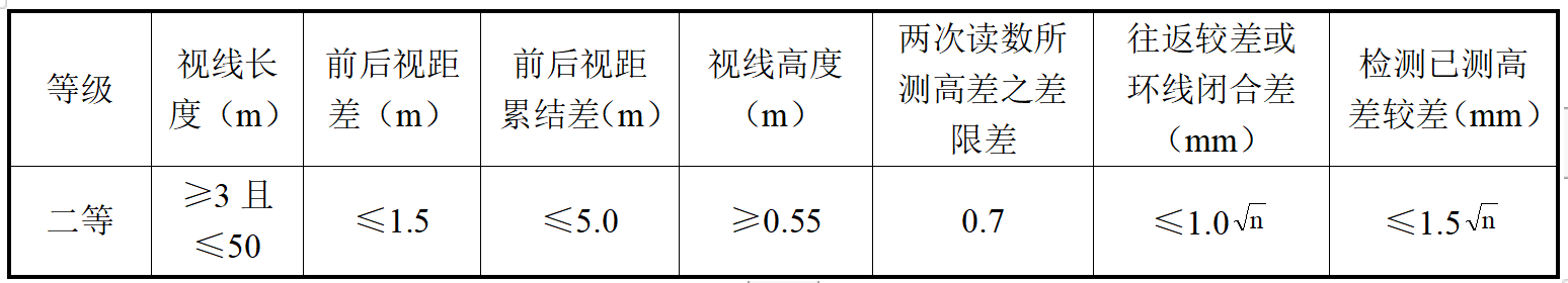 本项目中的主要技术指标外业数据采集时按照二级水准观测的技术要求进行操作和实施,根据《建筑变形测量规范》4.4.2的有关内容,水准观测的技术要求如下: