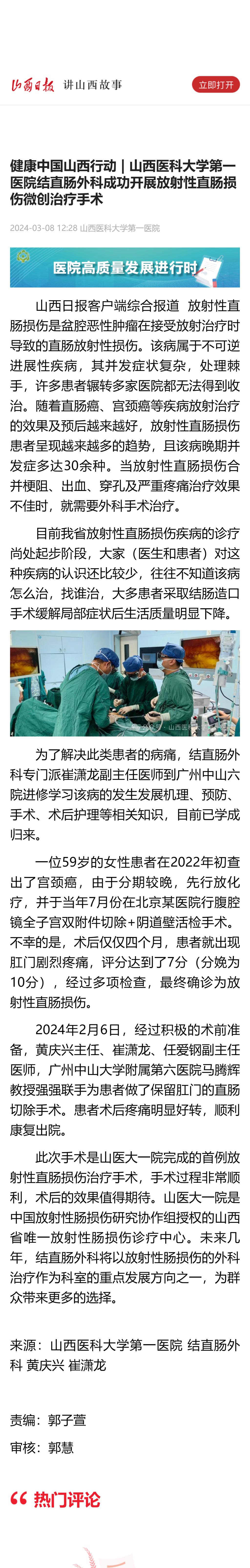 山西日报客户端|健康中国山西行动 | 无码流出 结直肠外科成功开展放射性直肠损伤微创治疗手术
