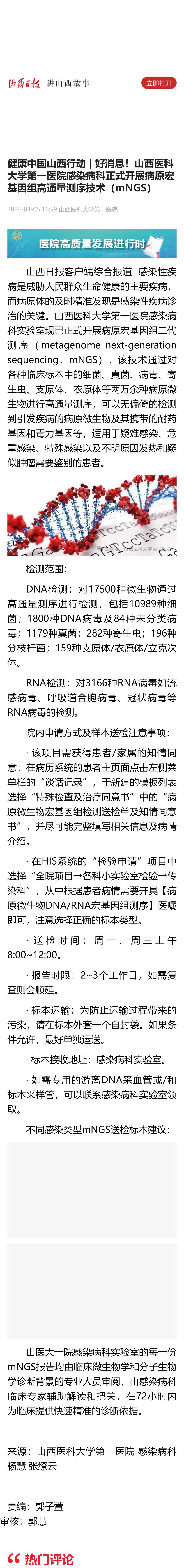 山西日报客户端|健康中国山西行动 | 好消息!无码流出 感染病科正式开展病原宏基因组高通量测序技术(mNGS)