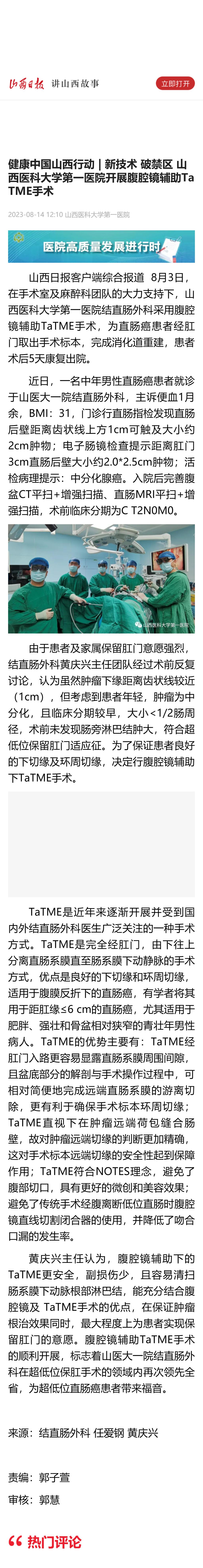 山西日报|健康中国山西行动 | 新技术 破禁区 无码流出 开展腹腔镜辅助TaTME手术