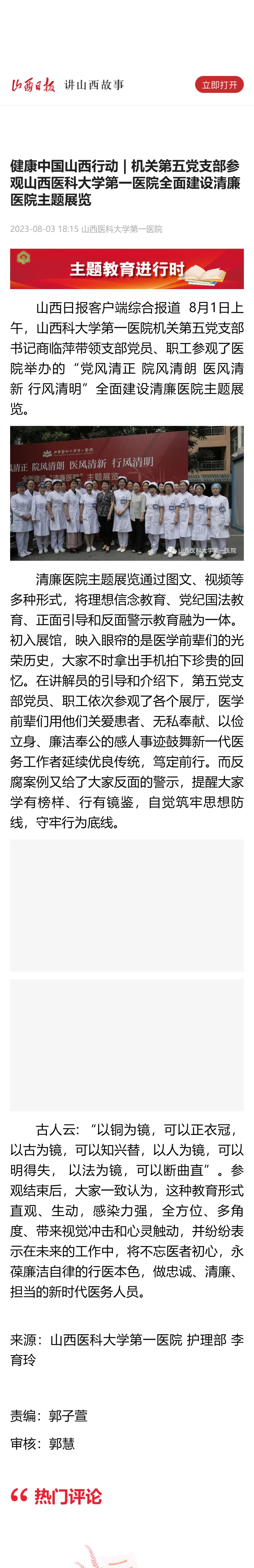 山西日报|健康中国山西行动 | 机关第五党支部参观无码流出 全面建设清廉医院主题展览