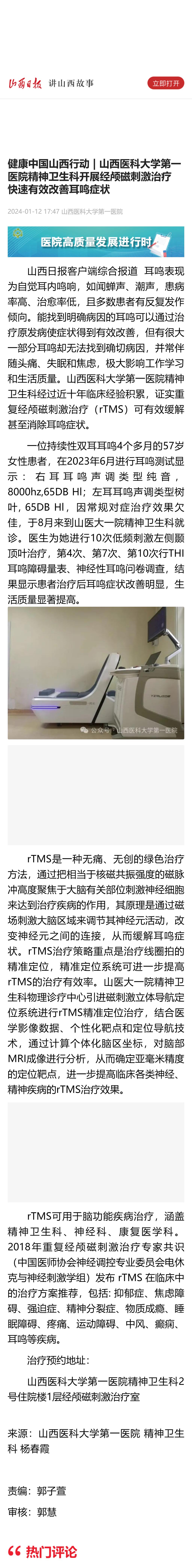 山西日报客户端|健康中国山西行动 | 无码流出 精神卫生科开展经颅磁刺激治疗 快速有效改善耳鸣症状