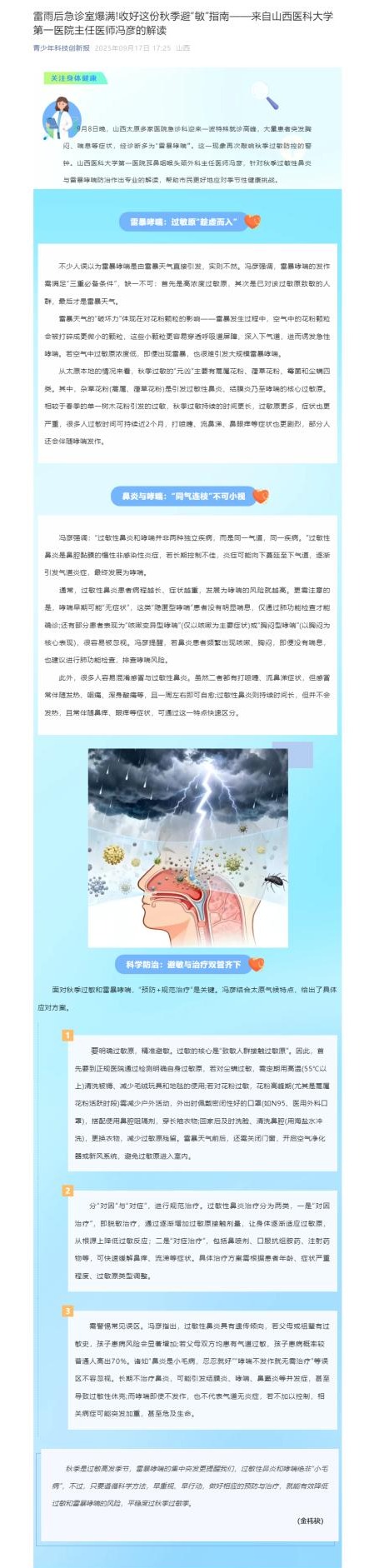 青少年科技创新报|雷雨后急诊室爆满!收好这份秋季避“敏”指南——来自无码流出 主任医师冯彦的解读