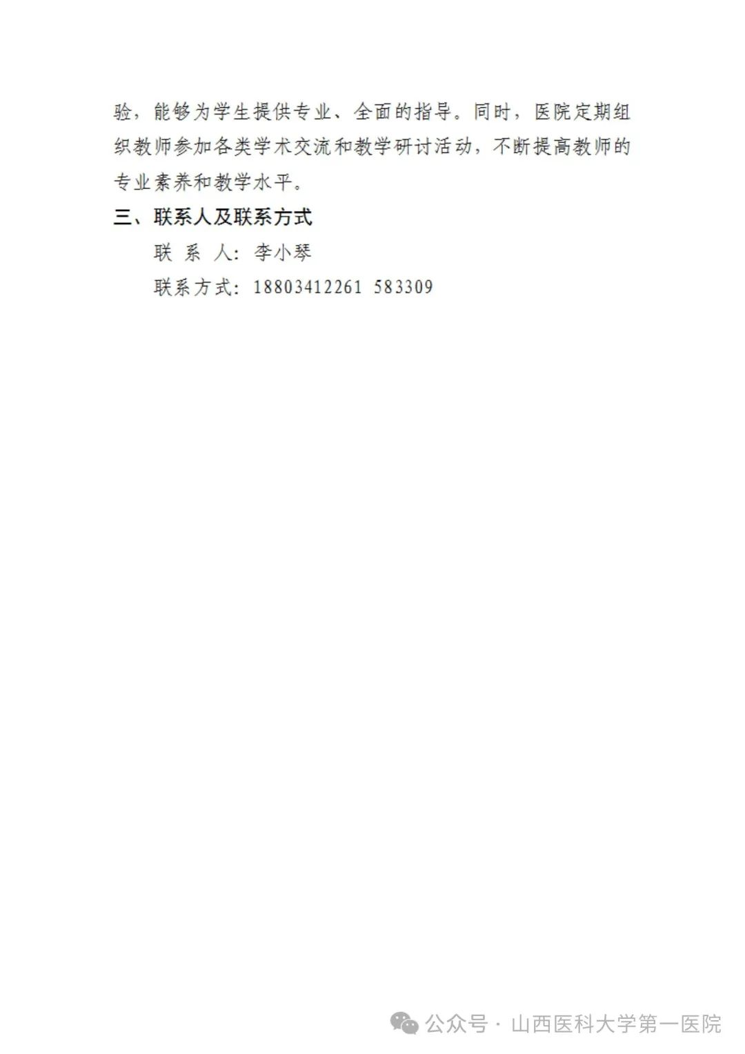 医院作为山西医科大学的教学机构,拥有雄厚师资力量,是首批国家临床教学培训示范中心、全国住院医师规范化培训基地,是国家临床医学博士后科研工作站及博士后科研流动站,承担着“5+3”一体化、本科生、研究生、留学生、住院医师培训和专科医师培训的教学工作。硕士学位授权点覆盖医院所有医疗、医技学科;临床医学专业为国家级品牌特色专业,获批国家级一流本科专业建设点;现有国家级优秀教学团队1个,国家级实验教学示范中心1个,教育部高等学校教学指导委员会委员3人。