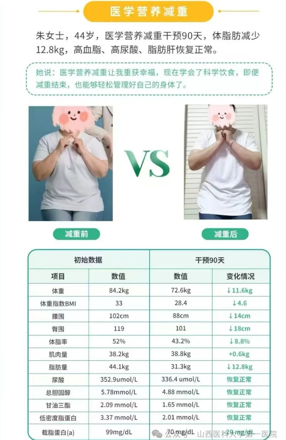 随着超重和肥胖问题日益突出,科学减重成为全民健康的重要课题。山医大一院临床营养科减重门诊深耕体重管理领域9年,由7名资深营养师组成专业团队,年均帮助2000余名患者成功减重,回归健康生活。值此“国家体重管理年”之际,我们始终秉持先进的减重理念:健康体重,不是数字的较量,而是生命的升华。始终坚持“科学营养,健康瘦身”!