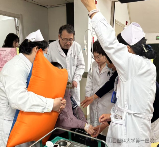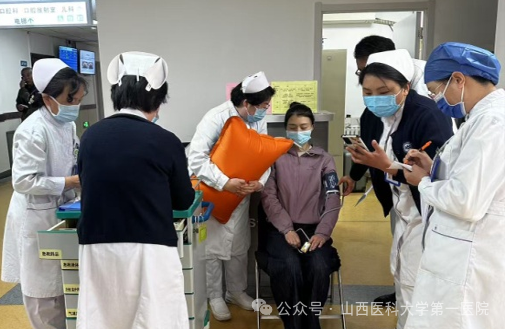 演练现场模拟一位28岁急性荨麻疹患者在就医后至一层缴费取药期间突发过敏性休克紧急状况。医护团队迅速响应,在急救过程中,医生密切观察患者病情变化,及时下达口头医嘱;护士甲乙双人核对、复述医嘱、及时给药,护士丙建立静脉通路、吸氧,护士丁进行生命体征监测,护士戊详细记录病情变化,医护人员分工明确、配合默契,直至患者生命体征平稳。