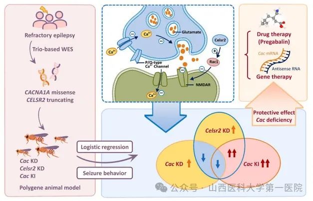 为深入研究CACNA1A和CELSR2的交互作用,研究团队利用果蝇建立了多基因动物模型,包括CACNA1A敲降、CELSR2敲降、CACNA1A-CELSR2双基因敲降。通过行为测试、逻辑回归分析、钙离子成像和药物实验,系统分析这些基因变异对癫痫发作的影响。研究发现,在果蝇模型中,CACNA1A或CELSR2单基因敲降均可诱发显著癫痫样发作,CACNA1A的错义敲入加CELSR2敲降果蝇出现严重的癫痫行为,类似患者的表现。而CACNA1A-CELSR2双基因敲降的癫痫表型却呈现明显缓解。这提示CACNA1A的功能缺失在特定遗传背景下对药物难治性癫痫具有保护作用。进一步的机制研究提示:1)患者CACNA1A错义突变表现为功能获得型(GOF)变异;2)CACNA1A与CELSR2分别通过调控突触前膜P/Q型钙通道和突触后膜NMDA受体通道,协同影响神经元钙稳态及谷氨酸能神经递质传递,最终导致癫痫发作。