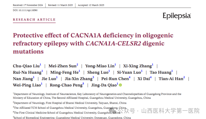 神经内科孙美珍教授,广东医科大学刘楚翘博士、彭荣超教授和广州医科大学附属第二医院神经内科廖卫平教授、乔景达博士合作完成了一项关于癫痫基因相互作用及其在药物难治性癫痫的保护机理研究。该研究在国际顶级癫痫期刊《Epilepsia》发表(中科院1区,影响因子6.6):Protective effect of CACNA1A deficiency in oligogenic refractory epilepsy with CACNA1A-CELSR2 digenic mutations。该研究聚焦一例同时携带CACNA1A和CELSR2两个罕见基因变异的药物难治性癫痫病例,利用果蝇模型构建多基因突变模型,结合逻辑回归分析,钙成像技术,药物和基因治疗技术,发现癫痫致病基因CACNA1A在不同遗传背景下具有致病/抗癫痫的多重作用,揭示了CACNA1A和CELSR2基因在癫痫发病中的交互作用,为认识寡基因背景下的药物难治性癫痫的发病机理提供了新思路,为其精准治疗带来新的治愈希望。