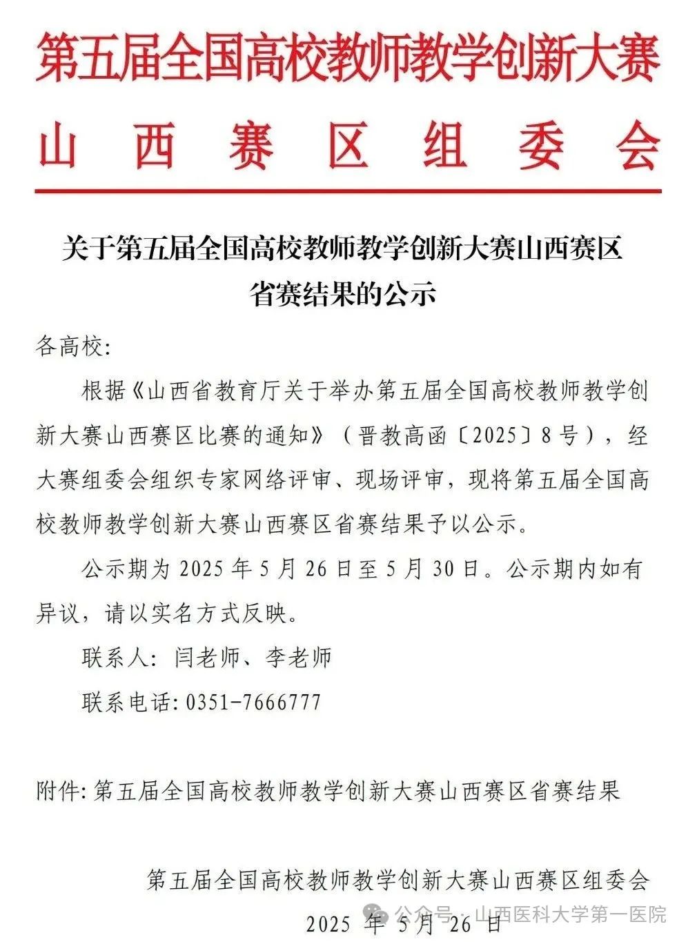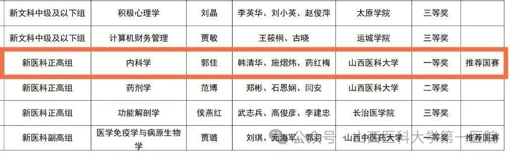 近日,由教育部高等教育司指导,山西省教育厅举办的第五届全国高校教师教学创新大赛山西赛区比赛落下帷幕。山西医科大学第一临床医学院内科教研室郭佳教师团队在此次省赛中表现卓越,凭借其扎实的教学功底和创新的教学设计和理念,从众多参赛队伍中脱颖而出,斩获山西省赛区一等奖,并被推荐参加国赛,取得了令人瞩目的优异成绩。
