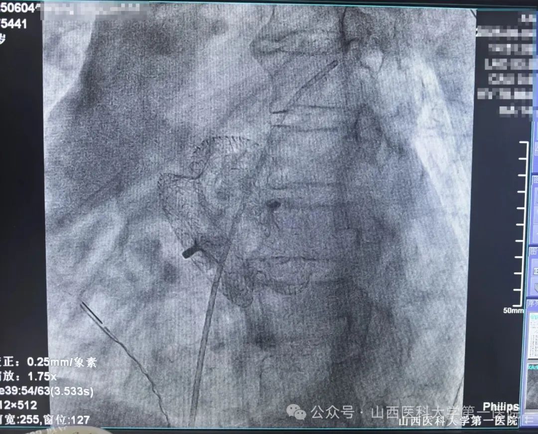 次日,通过超声影像科经食道超声再次精确评估,明确患者房缺缺损直径达37mm,肺动脉压65mmHg。一般临床中通过介入封堵的最大房缺为36mm以下,否则需要外科开胸来进行房缺修补,但患者心衰症状刚刚改善,身体整体状态欠佳,患者及家属对开胸手术存在很大顾虑。电生理团队经过评估后认为患者虽然巨大房缺,但各残缘情况尚可,存在介入封堵的可能,并结合技术优势可以在心腔内超声辅助下指导封堵伞的释放,再次与患者及家属沟通后决定采用射频消融+房缺介入封堵一站式微创手术方案,王睿主任医师团队顶着高难度高风险的压力为患者实施了三维标测下房扑射频消融术+房间隔缺损封堵术。术中,在可调弯长鞘的辅助下精细标测确定患者房扑为围绕三尖瓣峡部折返的典型房扑,三尖瓣峡部电隔离后患者房扑终止,恢复窦性心律;接下来,在心腔内超声指导下,选择42mm大封堵伞进行精确释放,成功封堵巨大房缺。封堵前后患者血氧明显改善,肺动脉压无进一步升高,观察二十分钟,患者无不适,反复牵拉实验示封堵伞位置稳定,遂释放封堵伞,完成手术。术后第三天复查心脏超声,显示封堵器位置固定,未见穿隔分流。
