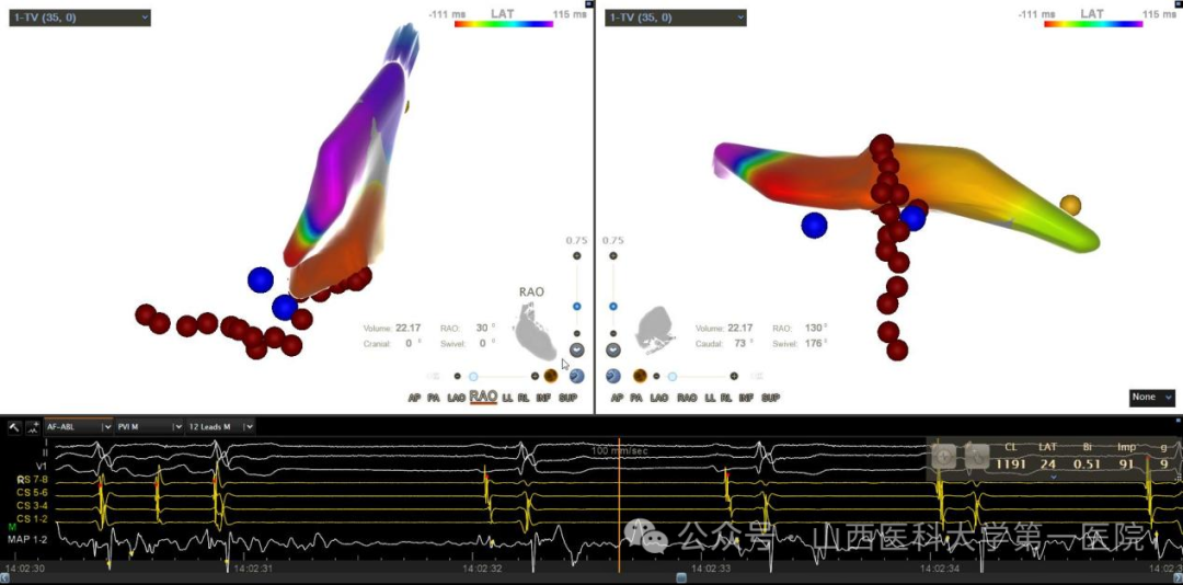 入院后,接诊医生车星星副主任医师给予对症治疗后患者心衰症状很快缓解,但在检查过程中发现患有房间隔缺损(缺损达到34mm)、肺动脉高压(PASP65mmHg),同时还存在持续性房扑,心室率最快达到150次/分以上,立即与电生理团队王睿主任医师、郭敏主任医师、高佳主治医师通过详细查体、询问病史及分析检查结果,一致认为该患者心衰的原因主要在于房扑所导致的快速心室率和巨大房间隔缺损,且肺动脉高压也与房间隔缺损相关,因此能否终止房扑并且封闭房间隔缺损是后续治疗的关键,但患者的巨大房缺能否通过微创介入方法封堵极具挑战性。经过详细术前讨论及与患者家属反复交流此次治疗的两大关键为:首先通过射频消融手术根治房扑,改善患者心功能;其次通过经食道心脏彩超精确评估房缺的大小及肺动脉高压情况,明确是否具备房缺封堵手术机会,从病因上解决问题。