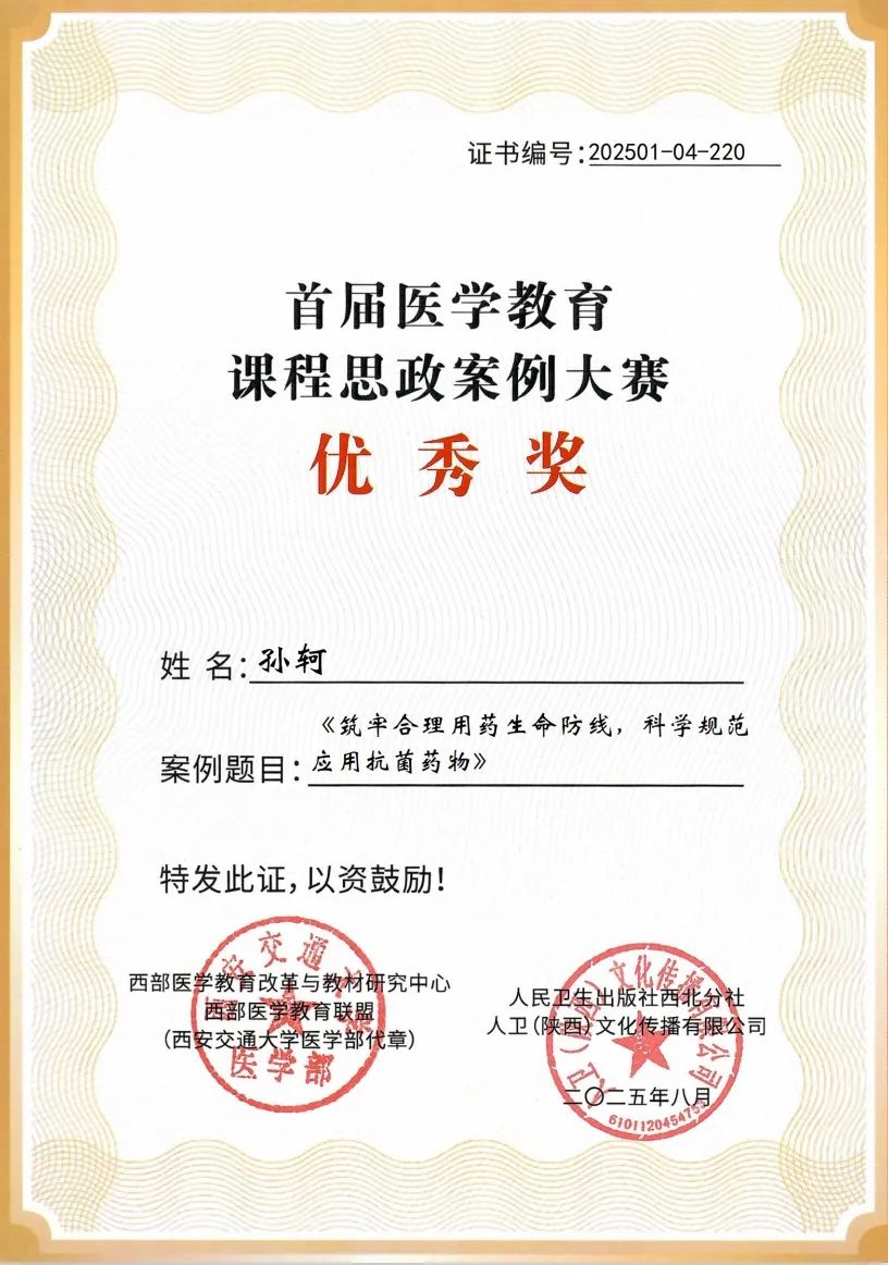 在首届医学教育课程思政案例大赛中,孙轲药师凭借临床药理学课程思政案例《筑牢合理用药生命防线,科学规范应用抗菌药物》,从全国众多参赛作品中脱颖而出荣获优秀奖。本次大赛由西部医学教育改革与教材研究中心、西部医学教育联盟主办,人民卫生出版社西北分社协办,孙轲在此次大赛中以触目惊心的药害事件为切入点,揭示了抗菌药物滥用的严重后果:系统梳理我国抗菌药物管理的十年攻坚历程,彰显“健康中国”战略的制度优势;并以真实临床场景为依托,生动呈现临床药师从“药品调配者”向“合理用药决策者”的跨越式转型,强化药师的社会责任感与专业使命感。