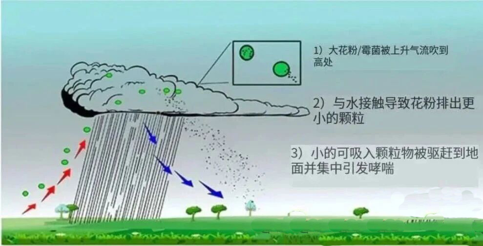 雷暴天气通常伴随着大风、强降雨和气压变化。在雷暴来临前,地面上的花粉或霉菌孢子会大量聚集。随着雷暴的开始,上升的气流将这些颗粒卷入高空,经过电活动的影响,花粉颗粒会被粉碎成更小的颗粒,并可能带有电荷。在雷暴消散时,这些细小的花粉颗粒会随着降雨和下降气流沉降到地面,导致空气中的过敏原浓度急剧上升。