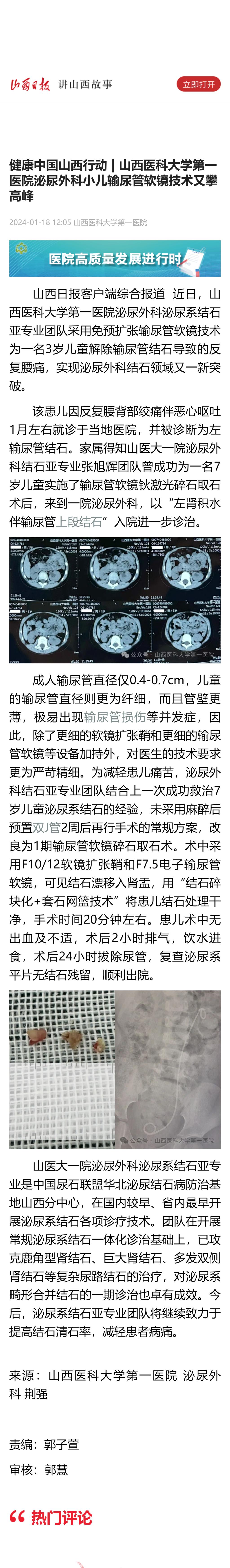 山西日报客户端|健康中国山西行动 | 无码流出 泌尿外科小儿输尿管软镜技术又攀高峰