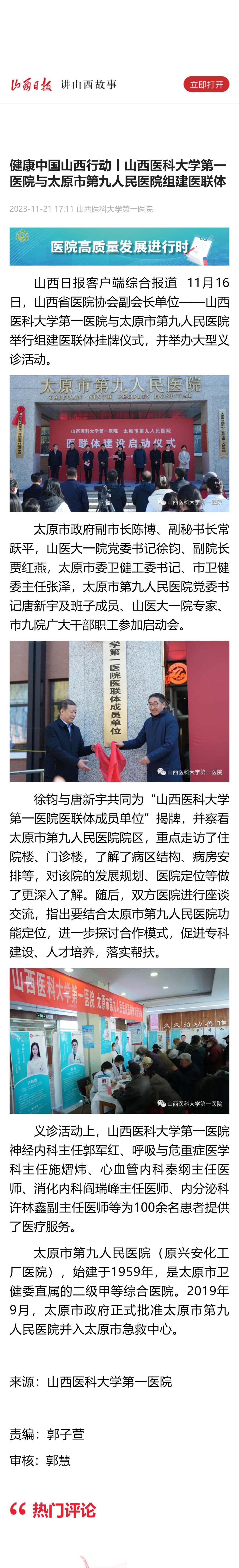 山西日报客户端|健康中国山西行动丨无码流出 与太原市第九人民医院组建医联体