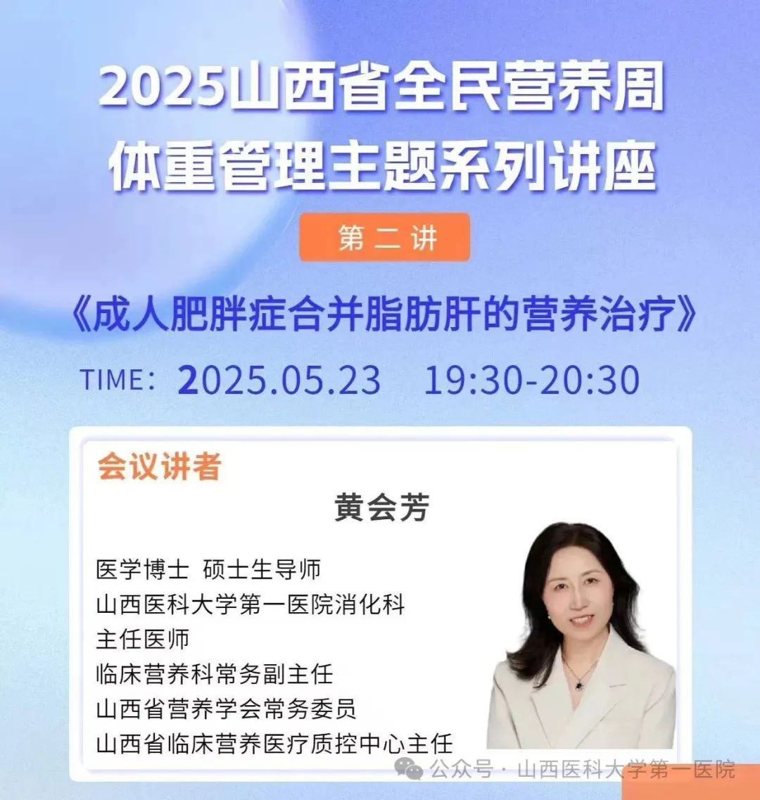 5月23日,黄会芳主任医师参加山西省全民营养周体重管理主题讲座,讲解了“成人肥胖症合并脂肪肝的营养治疗”,带领大家了解了脂肪肝、高血压、糖尿病等慢性病与饮食的密切关系,约70%的慢性病可通过科学膳食干预实现有效防控。