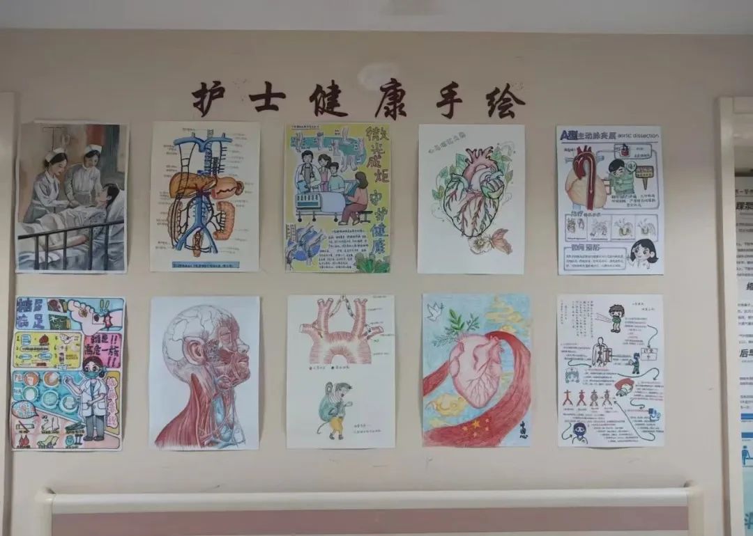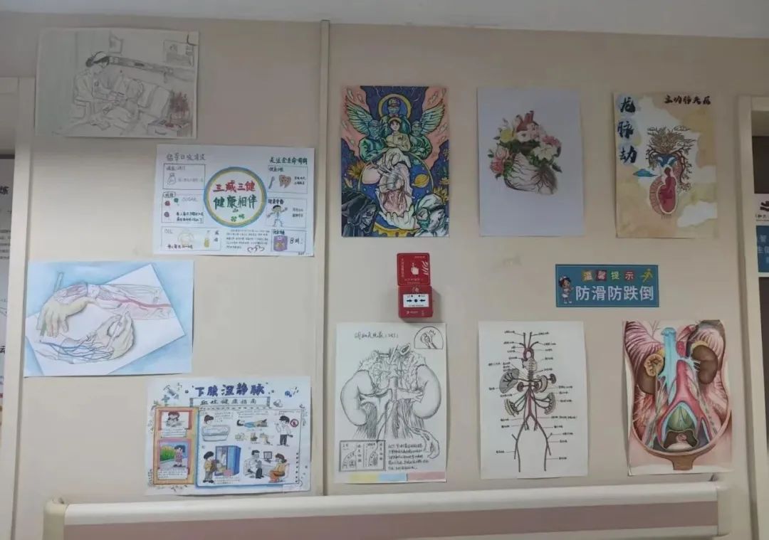 血管外科病区,首先映入眼帘的是一面温暖的“健康宣教画廊”——五十六幅由护士亲手绘制的科普画作挂满一侧走廊,色彩温和、内容丰富,将专业医学知识以图文并茂的形式娓娓道来,患者在这里不仅能接受治疗,更能感受到“有温度的健康教育”。